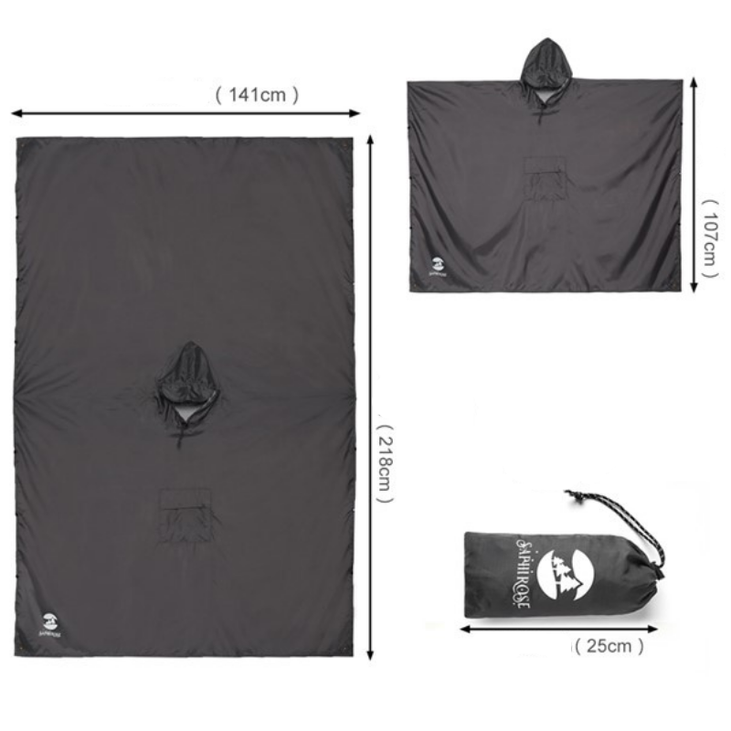 Ce poncho est bien plus qu’un simple imperméable. Grâce à son design ingénieux, il peut également se transformer en tente d’appoint ou en tapis de pique-nique lors de vos escapades. C’est l’accessoire polyvalent idéal pour les amateurs de camping, de randonnée et de pêche.