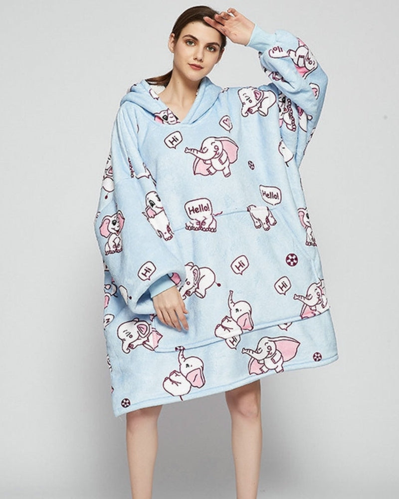 L’attrait principal de ce poncho réside dans son design ludique et artistique avec des éléphants dessinés qui apportent une note amusante à votre tenue d’intérieur. Il est parfait pour celles qui aiment allier originalité et praticité dans leurs vêtements de maison. Le bleu clair de la polaire ajoute une touche de couleur douce et apaisante à votre garde-robe.